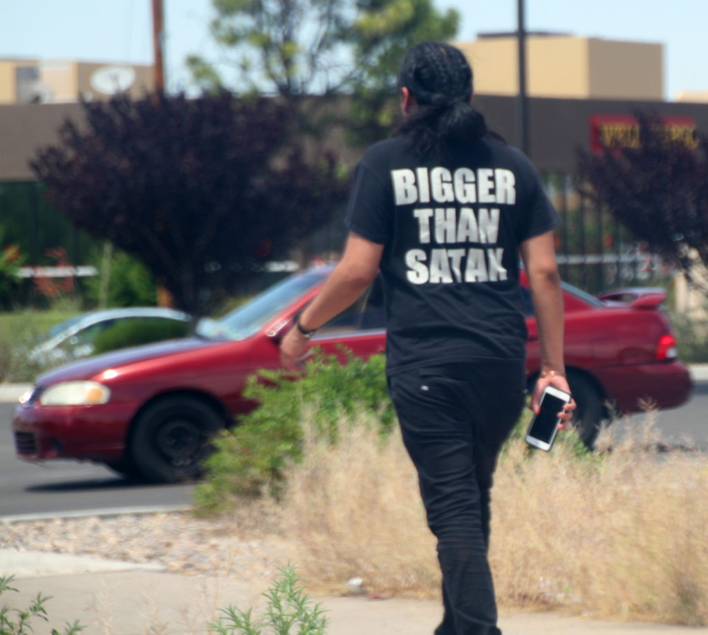 Sleeveless cotton wife-beater features orange and white font on black background with the message: “Bigger Than Satan Beiber.” I got the idea for the message from an actual citizen of Albuquerque who in fact was walking the length of South Central Avenue wearing a T-shirt of the like.