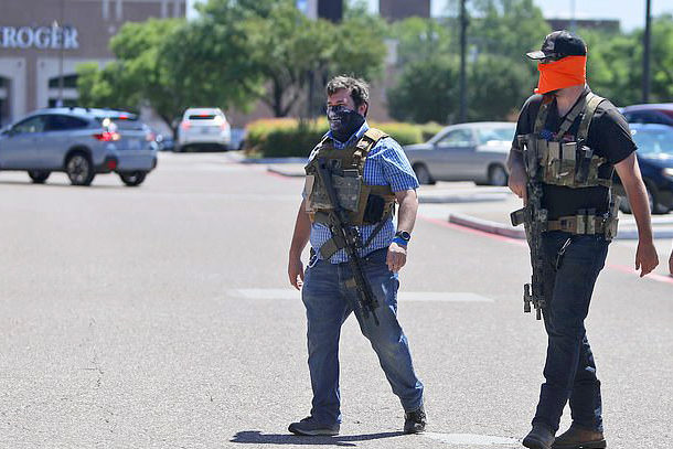 We continue to be “violated” by our government taking a snapshot of our license plate as we run a red light through a traffic intersection. We’re fed up and we’re not going to take it anymore — march against the machine! The two TX militia “men” in the photo above are pacing in the parking lot of a hair salon owned by a woman who is dismissing the order to quarantine and opened up her hair salon.