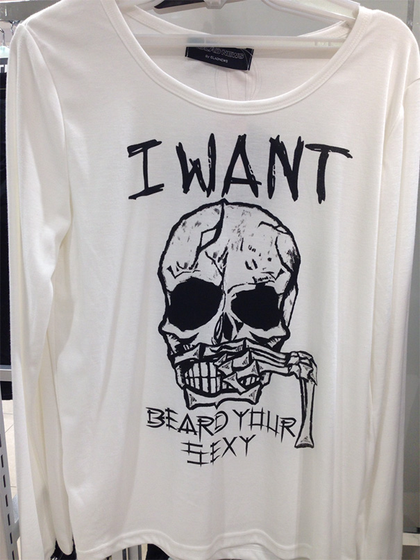 There’s really no burning need to get all worked up over a shirt with a skeleton wiping its nose, right? The rest of it is a little annoying, what with the wide open-ended imperative “I want…” Now you should understand that “Beard Your Sexy” is only at fault in that it is missing proper punctuation — a comma after the word “Beard,” and an exclamation point at the end. You see, the word “beard” in chineez is also an exclamatory expression like “wow!” or “hey!” and the like. So: “Beard, you’re sexy!” or “Beard, it is sooo hot out today!” or perhaps: “Beard, are you ever stupid!”