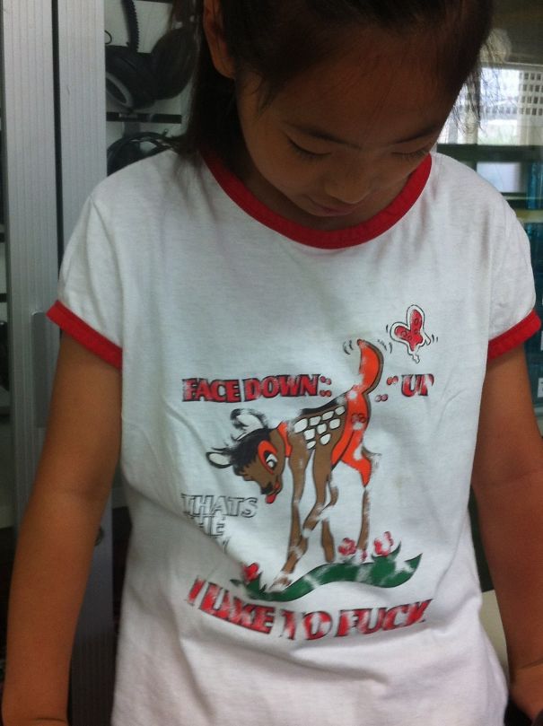 PARENTS, PARENTS, PARENTS!! what in the actual phuq are we doing here?? That shirt does not only guarantee you a call from Principal Skinner, but also a personal house call from the Department of Child Protective Services. Parents don’t send your six-year-olds off to school with no shirt with a downward-facing fawn on it — they are a bad influence! Look what happened to Bambi — Bambi grew up stripping at Tony Soprano’s Badd-Bing club!