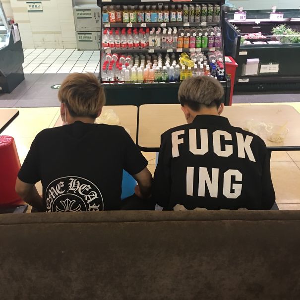 These bros are looking pretty super-rad hip-hop western legit in their Ice-G garb. Fucking-boy thinks his shirt reads: “Woodstock ’69” — please, none of us ever tell him!