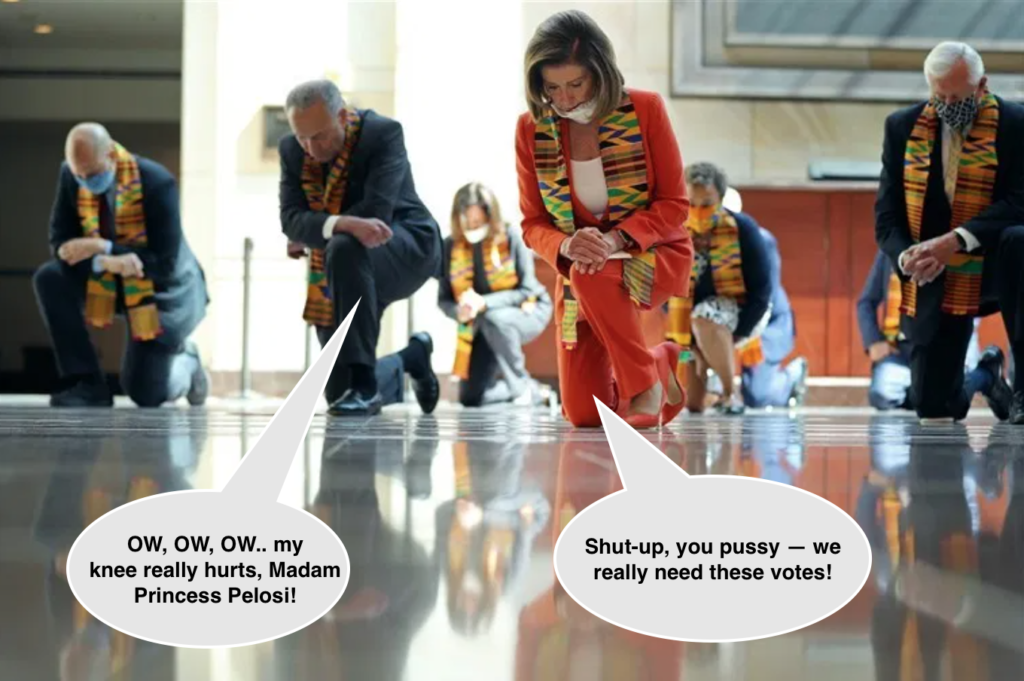 Let’s kneel for eight minutes and who-gives-a-shit seconds, symbolic of how long officers Reed and Maloy knelt on the new George Washington. Say, Hot-Pants, what about memorializing the captivity of an actual icon — Nelson Mandela — with a gesticular kneeling clad in kente scarf and head bowed for… 25 years!