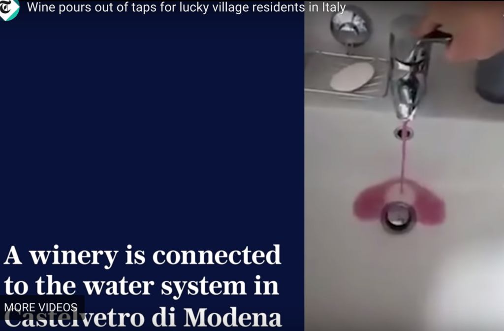 There’s no scientific or engineering explanation for the incident, just some pipes got crossed up between the water company and a local winery and — presto! In the U.S. we have a rigorously sophisticated infrastructure to keep potable water and sewage from mixing — only in Italy does wine get spilled into their water supply.