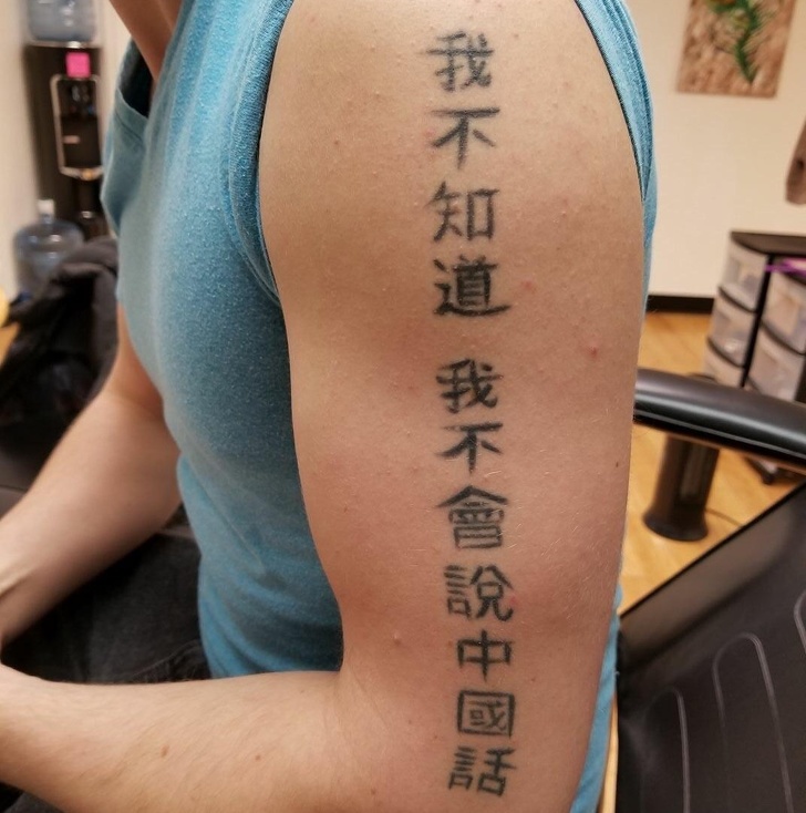 It begs folks to ask him what his tattoo says, and when they do he will tell them exactly what it says: “I don’t know, I don’t speak Chinese,” ah-ha-ha-ha-ha.