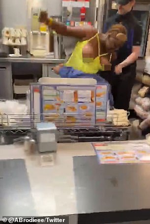 They went back in after the phone but an employee had already secured it and was holding it hostage until they paid their bill. That didn’t settle well with the welchers and a brawl ensued behind the counter. The brouhaha delivered plenty as one beauty queen lost her wig immediately, her disgusting breasts flying out of her tank top as she hefted hooks and haymakers.