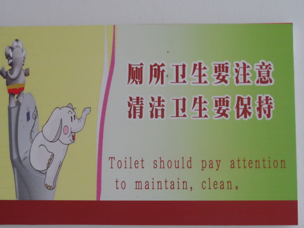 I really want to include this total lost-in-translation moment here. The Chineez do their own work — usually without a net — and really could give a $hiite less what Westerners get out of their translation. I will translate for you the two sentences in chineez: “Please mind restroom sanitation; preserve the sanitation and cleanliness of the restroom.” A pretty wordy way of what we roundeyes would probably get good results with just a simple: “Please Keep Restroom Clean.”