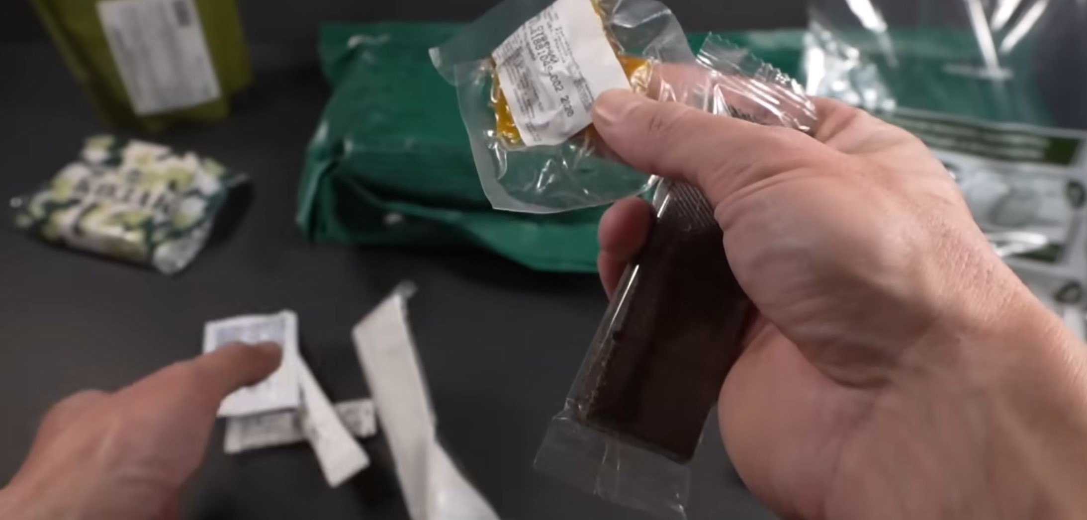 Among the contents, you’ll find a small packet of dried apricots and a dark chocolate bar. Not too shabby for field food.