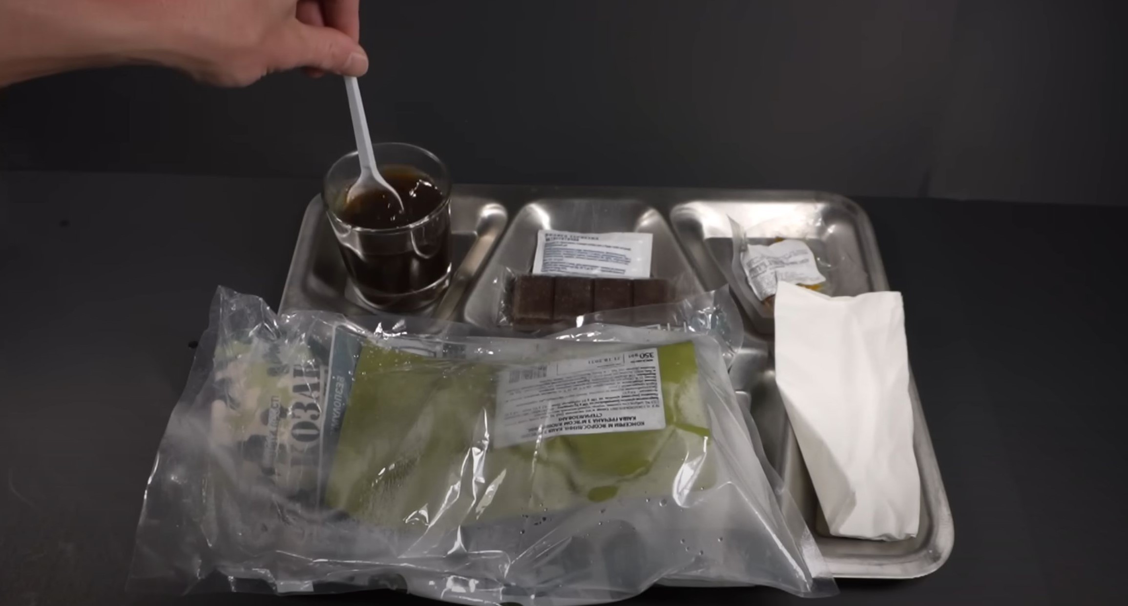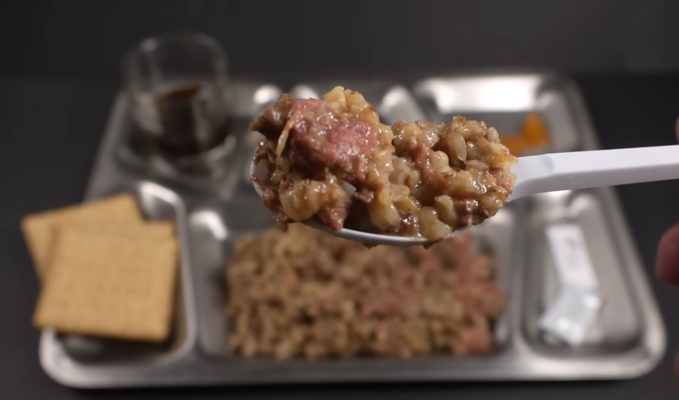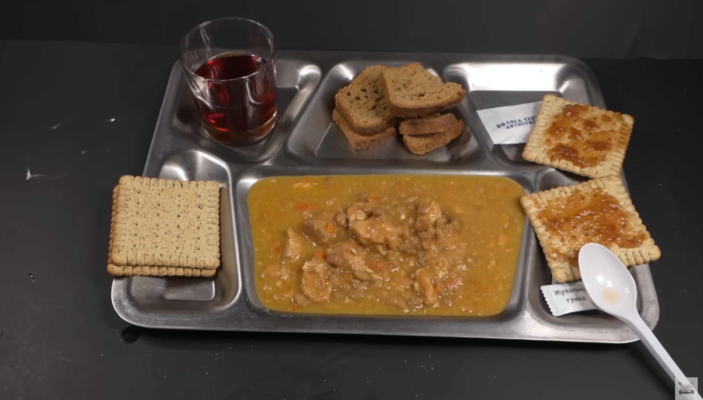 For the main course, we have chicken and vegetable stew. He also drinks the coffee, which he ranked an “Ok,” and made a cup of Ceylon tea from the MRE. It also came with the rye toast seen here and crackers upon which he has spread apple jam. What you don’t see here is the packet of split pea soup with pork that he’s heated up. He says the pork smells like bacon. You really should watch the video; it’s an amazing amount of high-quality-looking food.