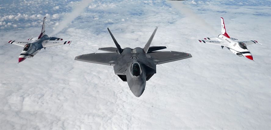 Featured image: Two U.S. Air Force Thunderbirds and an F-22 Raptor, assigned to the Air Combat Command F-22 Demonstration Team, Langley Air Force Base, Virginia, fly in formation July 14, 2017, after aerial refueling over France. The flight was on their way to the 2017 Royal International Air Tattoo airshow at RAF Fairford, England. | U.S. Air Force photo by Senior Airman Justine Rho