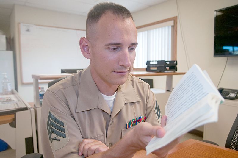 Sgt. Miguel Iles, an Asia-Pacific cryptologic linguist with 3rd Radio Battalion, reads a traditional Chinese legend in his office on Marine Corps Base Hawaii.
