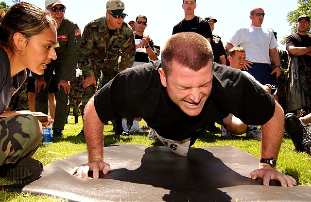 Airman executing a push-up as part of the United States Air Force Fitness Test (United States Air Force, Public domain, via Wikimedia Commons)