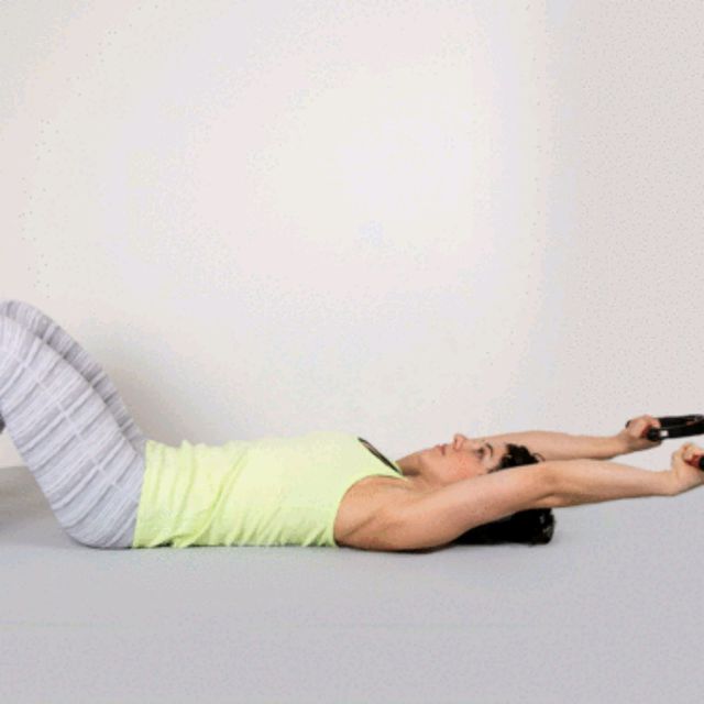 Take your resistance band and anchor it on something sturdy, not too high from the ground. Next, lie on your back with your head toward where you anchored the band. Your head should be one to two feet away from the anchor point. Grab the band with both of your hands while keeping your thumbs pointing upward and your arms facing away from each other. Then, keep your core tight and your elbows straight before you pull the band down toward your hips. Slowly return to your starting position while maintaining control. That’s one rep.