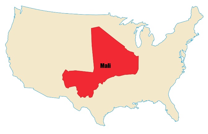 Mali is a large country, almost twice the size of Texas. I’ve attached a comparison map for all of you visual learners out there. The nation is shaped sort of like a butterfly. The Northern wing (or the portion on the right for all of you hopeless humans out there) is Northern Mali (also known as Azawad) – where all the fighting is. Northern Mali in its entirety is located in the Sahara desert. while the Southern portion is more fertile and “green.”