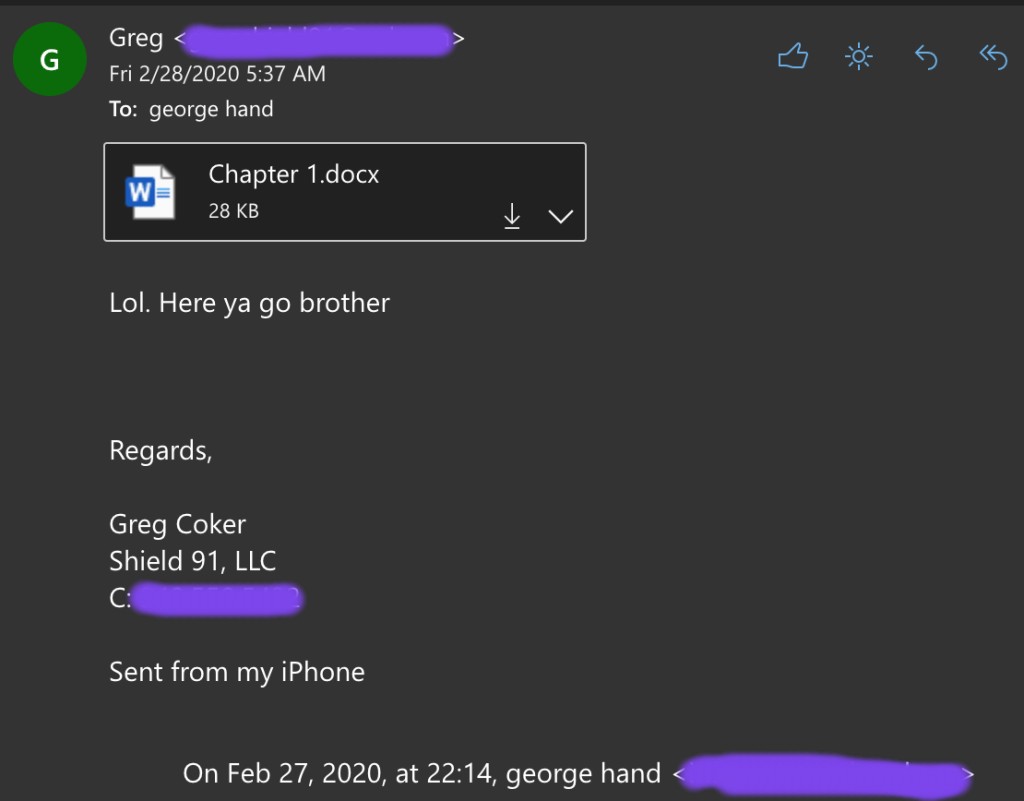 Secondly, when you tell a brother like Greg to get to work, you better take cover because scunion is gonna fly and there will be blood and sonic booms. The next thing I knew chapters were flying at me every single day, and sometimes two at a time.