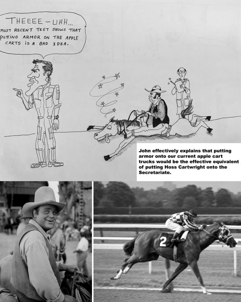 Cartoon commemorating the time John C. soundly convinced the command staff that applying armor to some of our already underpowered and belabored trucks was foolish. The trucks, which we called “Apple Carts,” were purchased for clandestine personnel transport and nothing more. (below left) the Hoss Cartwright Character from the TV series Bonanza and the racehorse Secretariat.