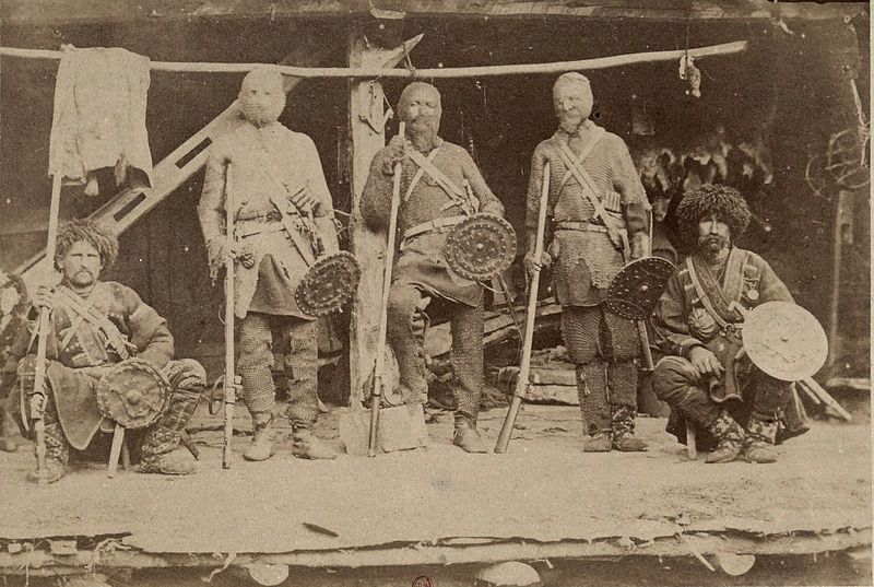 Khevsur warriors wearing their traditional armor. Barry (captain). F. 27. Chewsours. Scientific mission of Mr. Ernest Chantre. 1881. (Barry (18..-19.. ; capitaine), Public domain, via Wikimedia Commons)