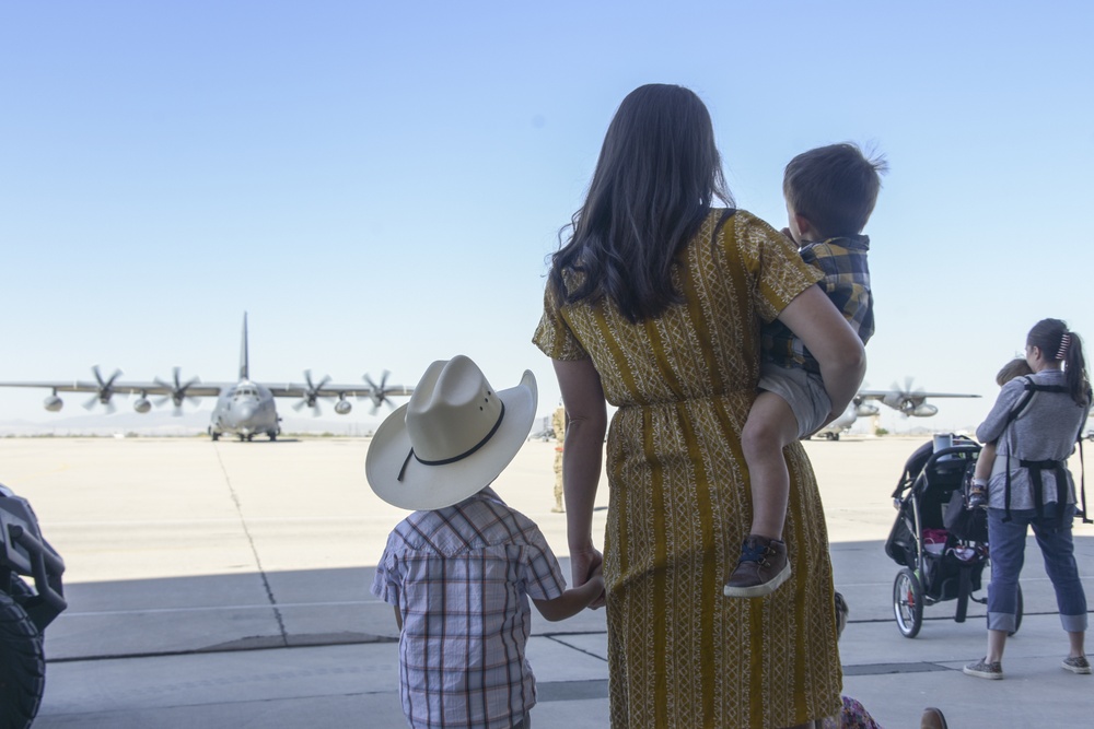 Families watch a U.S. Air Force HC-130J Combat King II taxi on the flight line at Davis-Monthan Air Force Base, Arizona, on May 24, 2021. Families and friends came to wish a farewell to Airmen from across the 355th Maintenance Group and 563rd Rescue Group as they deployed to an undisclosed location. (U.S. Air Force photo by Senior Airman Jacob T. Stephens)