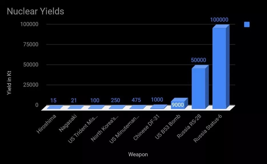 Comparison of American, Chinese and Russian nuclear weapons. Important to note: America has decommissioned its arsenal of B-53 nuclear bombs.