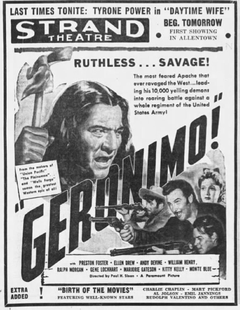 Strand Theater advertisement for the American western film Geronimo (1939). Paramount Pictures, Public domain, via Wikimedia Commons