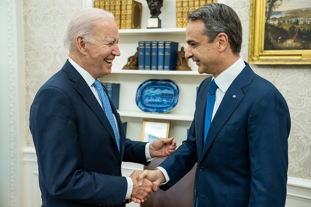 President Joe Biden greets Greek Prime Minister Kyriakos Mitsotakis in the Oval Office on Monday, May 16, 2022. (Official White House Photo by Adam Schultz)