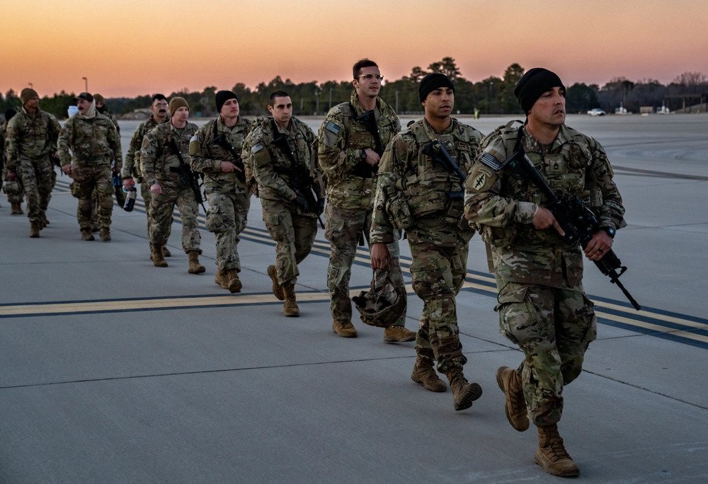 U.S. Army Paratroopers assigned to the 82nd Airborne Division walk to their aircraft at Pope Army Airfield, N.C. February 14, 2022. The 82nd Airborne Division is being deployed to reassure our NATO allies, deter any potential aggression against NATO’s eastern flank, train with host-nation forces, and contribute to a wide range of contingencies. (U.S. Army photo Sgt. Hunter Garcia).