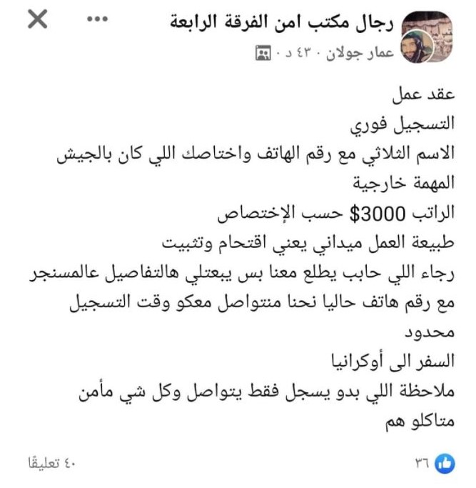 The ad was posted on a private group for soldiers of the Fourth Armored Division, one of the largest in the Syrian Army. The comments were filled with requests for contact numbers so they could enquire further.