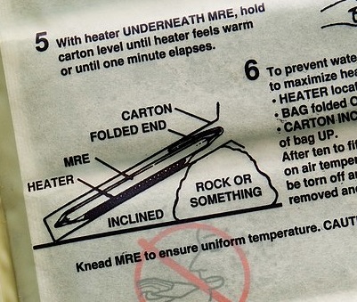 MRE comes with a flameless ration heater so you could at least get warm meals but why does the label say to incline on a “rock or something”?