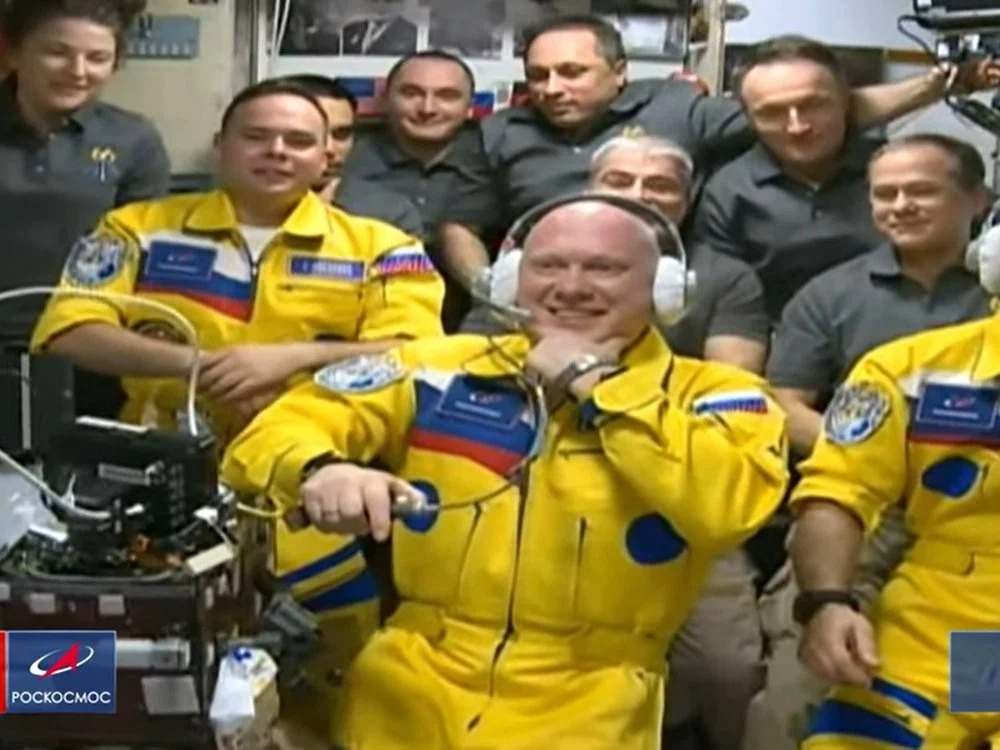 The Politics of Space. Russian Cosmonauts in yellow and blue flight suits had the internet buzzing about it being a show of support for Ukraine. Russia says they just had a lot of yellow fabric on the shelves they needed to use.