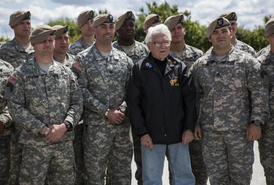 World War II veteran Tony Vaccaro stands with members of the U.S. Army Rangers at Pointe du Hoc on June 5, 2014.