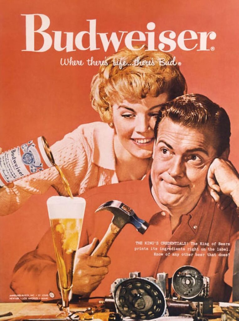 There’s Mom, happily pouring Dad a cold one while he quietly contemplates smashing the crap out of something mechanical with a hammer. Damn, I miss the good old days. Image source: Budweiser via Bored Panda