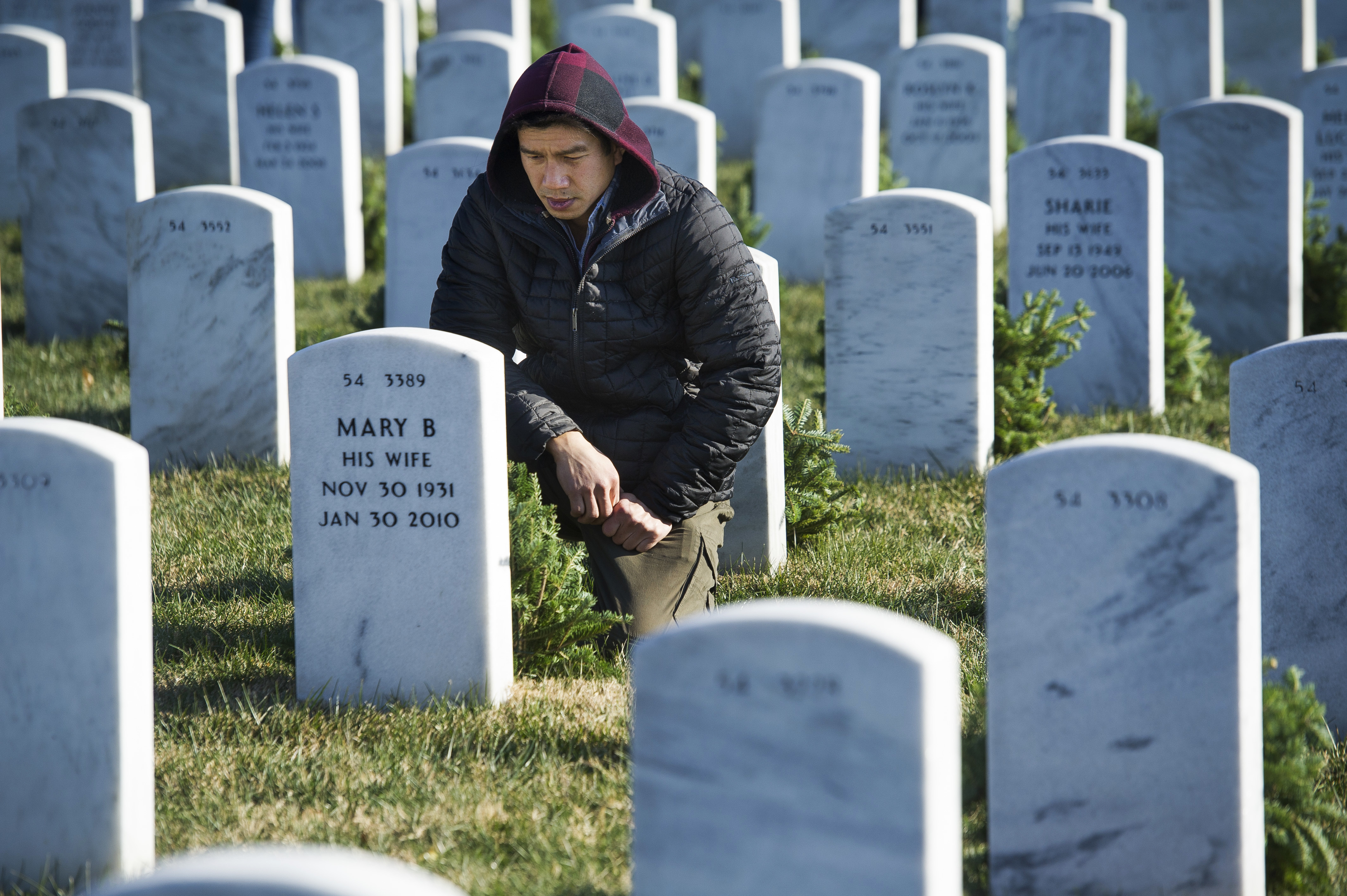 Ken Lai, of Berryville, Va., pauses after placing a wreath at a headstone in Arlington National Cemetery as Wreaths Across America places remembrance wreaths on headstones at the cemetery in Arlington, Va., Saturday, Dec. 16, 2017. (AP Photo/Cliff Owen)