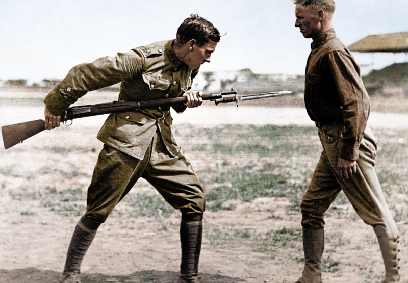A British cavalry sergeant major instructs an American soldier in bayonet charging at Texas’ Camp Dick. Cassowary Colorizations, CC BY 2.0, via Wikimedia Commons