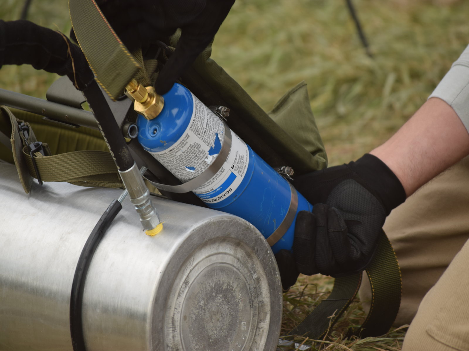 Propane canister being installed at the bottom of the pack frame.