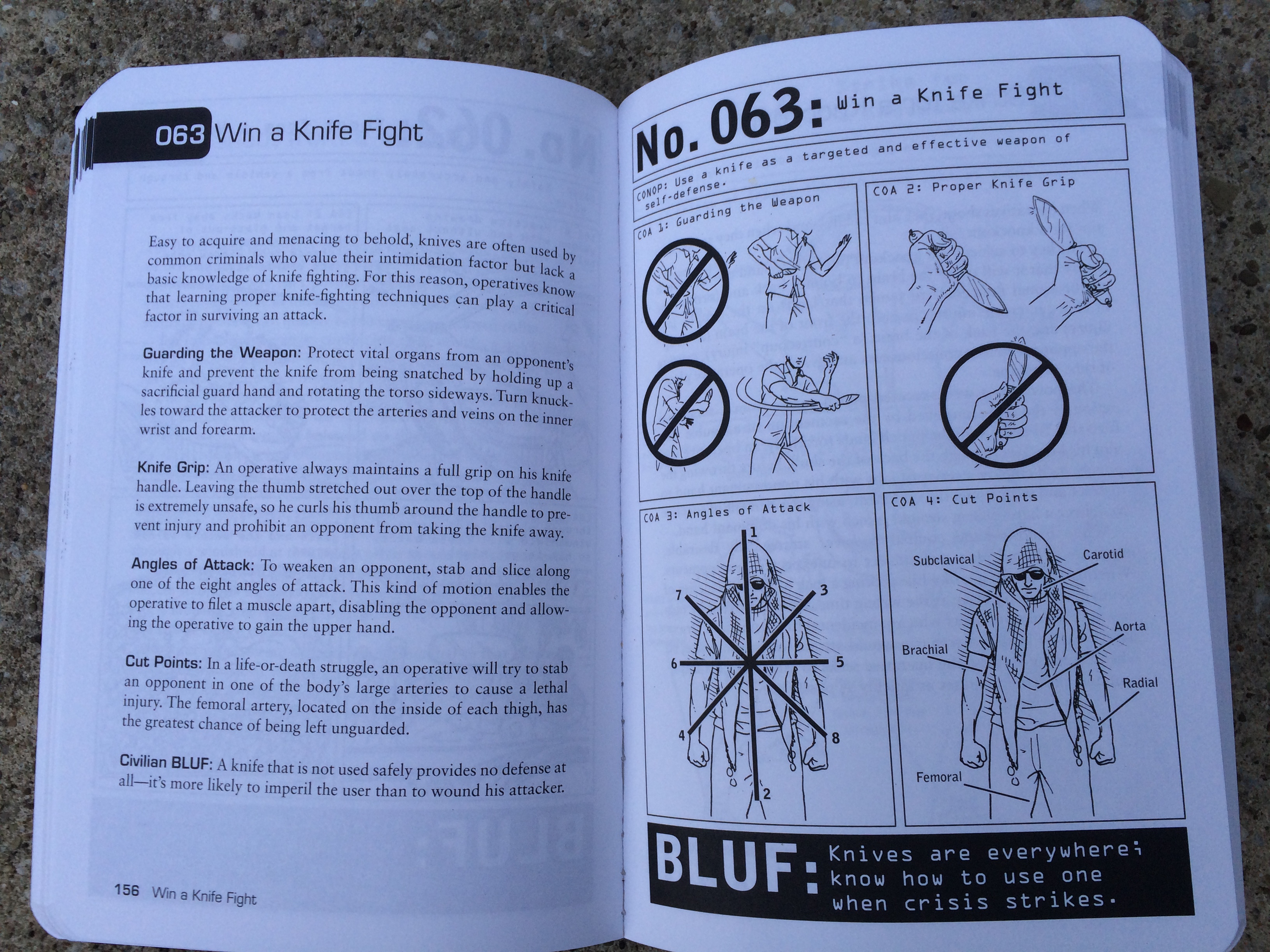 In the book ‘100 Deadly Skills‘ Clint Emerson discusses the importance of knowing how to use a knife as a weapon. Many people carry knives for everyday carry and as a defensive weapon, but don’t have the necessary training and skills to effectively employ it as a weapon. Clint Emerson gives us a quick down and dirty lesson covering the knife grip, angles of attack, and most effective cut points. These three principles all remain the same whether you’re using a folding knife or fixed blade.