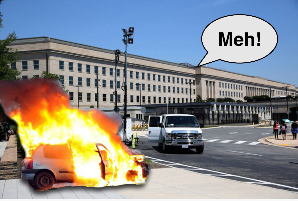 Even if the lower Paleozoic punk had managed to detonate that car — which wasn’t even his — the crusty Colonels on the inside would probably just stand there gawking at the fireball through their office windows sipping coffee: “Pshhh… that ain’t shit, son… I was on duty here on 9-11!”