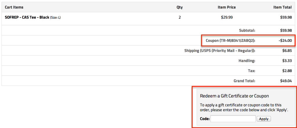 Just enter the discount code in the Coupon Code field on the checkout page.