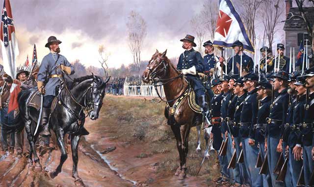 Gordon, at the head of the marching column, outdoes us in courtesy. He was riding with downcast eyes and more than pensive look; but at this clatter of arms he raises his eyes and instantly catching the significance, wheels his horse with that superb grace of which he is master, drops the point of his sword to his stirrup, gives a command, at which the great Confederate ensign following him is dipped and his decimated brigades, as they reach our right, respond to the ‘carry.’ All the while on our part not a sound of trumpet or drum, not a cheer, nor a word nor motion of man, but awful stillness as if it were the passing of the dead.