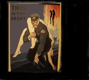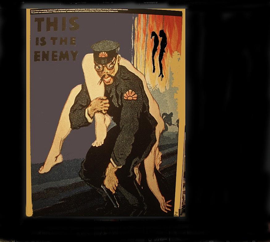 During World War II, American propaganda portrayed the Japanese and Germans as animals so that it wouldn’t be as hard for American troops to kill the enemy. Often the racist stereotypes of the Japanese with thick glasses, buck teeth, and sometimes apelike features would be shown. One particular poster had a Japanese soldier with crossed eyes carrying a limp, naked white woman over his shoulder and was emblazoned with, “This Is the Enemy.”