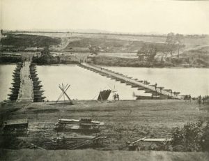 Burnside had gotten the drop on Lee and the Confederates were caught by surprise. But there was a major snafu in the Union’s plan. The pontoon bridges that Burnside needed to get across the river were delayed, by bureaucratic bungling. Lee anticipated the Union would push quickly across and he didn’t have the troops in the area to stop them. He planned on defending the next strategic location, along the Anna River, but once he saw how slow the Union troops were moving he ordered all of his troops to Fredericksburg. In fact, the pontoons Burnside needed were nearly two weeks late in arriving. It wasn’t until December 11th, that Union engineers built five pontoon bridges, under fire to get the troops across.