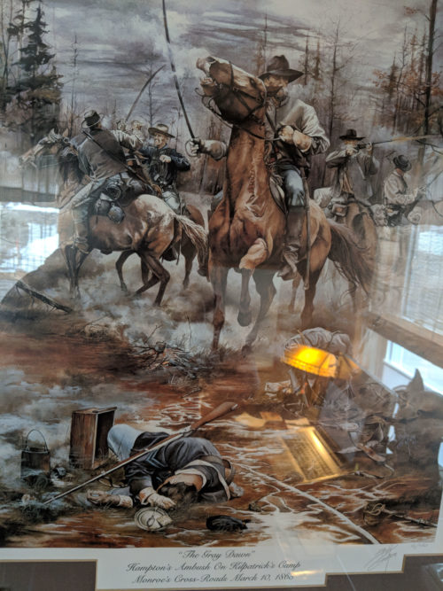 Having visited the area and Bentonville a few miles away many times while stationed at Ft. Bragg, I came across a print of the battle in 1995 and had it matted and framed. It hangs in my office to this day. As a youngster, I couldn’t read enough about the cavalrymen on both sides and this was one of my favorite prints.