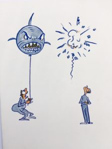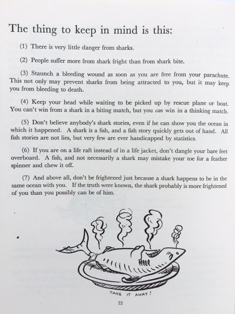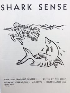 But the Navy wanted to let the sailors know about the low probability of being bitten by sharks and once the repellent went into widespread use, they also published a pamphlet called, “Shark Sense” which spelled it all out, and in the military’s never-ending pursuit of the lowest common denominator, published it with a cartoon, something that would continue well into the 1980s.