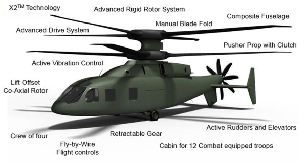 Boeing has stated that the commonality between the attack and assault aircraft developed at 85 percent which will reduce life-cycle costs and development. The Defiant utilizes “two coaxial rotors on top that rotate in opposite directions, the extra lift from each rotor’s advancing blade balances out the diminished lift from the opposite side’s retreating blade to eliminate retreating blade stall.”