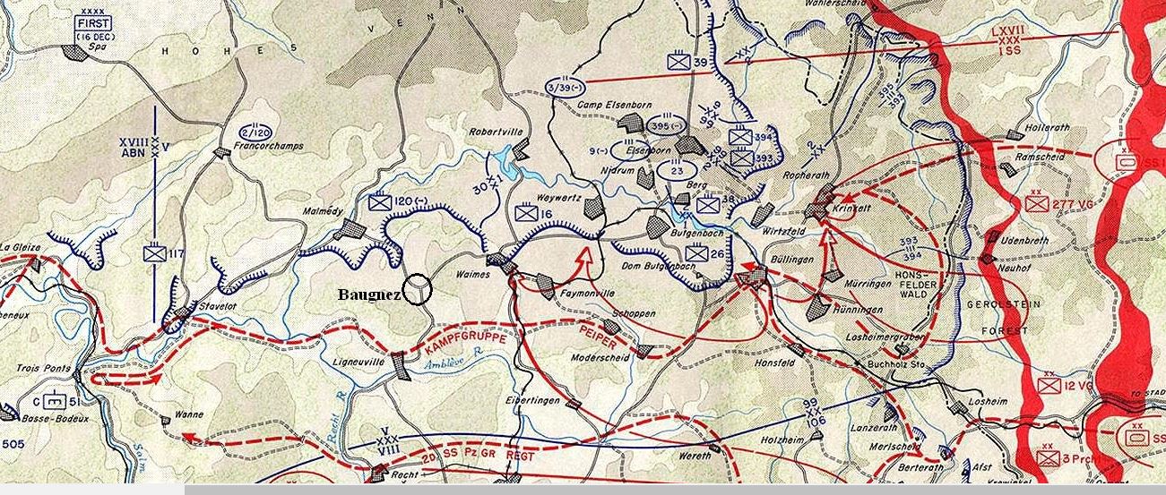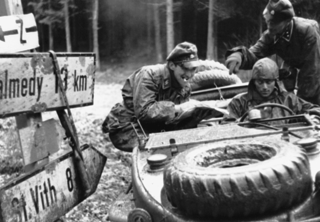 The Germans Attack: At 0530 on December 16, the Germans began their attack along the front. Artillery pounded US positions from between 20-90 minutes. The German Volksgrenadiers who were to punch a hole in the green American 99th Infantry Division were delayed in breaking thru. The untested and heavily outnumbered Americans delayed the German advance for four hours. The result was a huge traffic jam behind the lines for Peiper’s armored force. He didn’t break thru until after dark, far behind his timetable, but drove his men all thru the night, not stopping. He initially lost five of his tanks when they rolled over an old German minefield