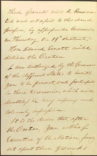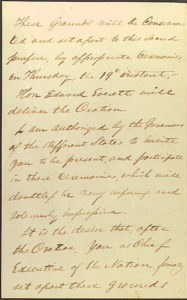 Just four and a half months after one of the bloodiest battles in American history at Gettysburg, Pennsylvania, the ground of the battlefield was being rededicated as the “Soldiers’ National Cemetery” at Gettysburg. President Lincoln was invited to attend and give a few words but he was not slated to give the “oration” on that day. Edward Everett was to deliver that honor and Lincoln was only to deliver a few remarks at the closing.