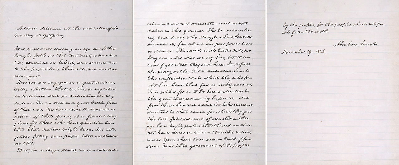 But, in a larger sense, we can not dedicate — we can not consecrate — we can not hallow — this ground. The brave men, living and dead, who struggled here, have consecrated it, far above our poor power to add or detract. The world will little note, nor long remember what we say here, but it can never forget what they did here. It is for us the living, rather, to be dedicated here to the unfinished work which they who fought here have thus far so nobly advanced. It is rather for us to be here dedicated to the great task remaining before us — that from these honored dead we take increased devotion to that cause for which they gave the last full measure of devotion — that we here highly resolve that these dead shall not have died in vain — that this nation, under God, shall have a new birth of freedom — and that government of the people, by the people, for the people, shall not perish from the earth.
