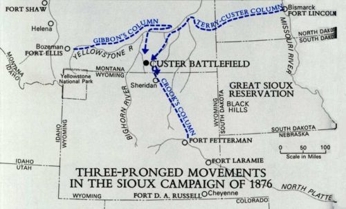 While the Plains Indians were gathering for the traditional annual Sun Dance ceremony where they pray and make personal vows, the Army was deploying troops in what they described as a three-pronged approach to force the Indians back to a reservation. Unbeknownst to the troopers, there were 6000-7000 Indians encamped.