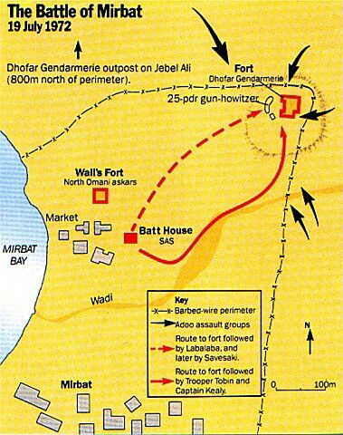 Mirbat Castle is a square multi-story structure which, in 1972, sat adjacent to and was part of a series of sandbagged trenches, firepits, barracks, latrine and a team room known as the British Army Training Team (BATT) house. The BATT house was run by nine S.A.S., with Captain Mike Kealy in charge. The entire base covered several hundred meters and was girded by barbed wire, which reached to the nearby Mirbat bay. For support, they counted on an additional 40 Omani and Pakistani soldiers, and used the base to conduct operations and guard the approach to the Port of Mirbat, vital to Oman’s economy and an important objective of PFLOAG.