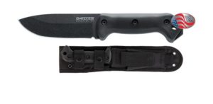 The black handle comes in ballistic nylon or Kydex. The sheath is made of nylon and has MOLLE attachments. Just over 12 inches in length, with a 7 inch partially serrated edge blade. It is a tough customer and will withstand heavy use.