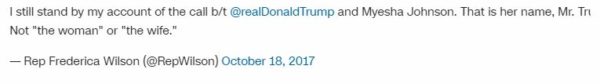Florida Rep. Frederica Wilson, claims that she was in the car with Johnson and that the President told Myeshia Johnson that “he knew what he signed up for, but I guess it still hurt.” Wilson also claims that the President didn’t even know the soldier’s name and that after the call, Johnson “broke down” sobbing. Wilson’s claim was corroborated by Cowanda Jones-Johnson, a family member who raised Johnson and who was also in the car at the time of the call.