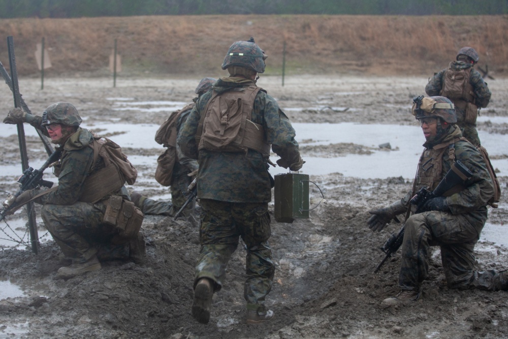 U.S. Marines with 2nd Combat Engineer Battalion, 2d Marine Division (2d MARDIV) move through a path cleared by Bangalore Torpedos during the Sapper Leadership Course at Camp Lejeune, North Carolina, Feb. 20, 2020. The Sapper Leadership Course is a training event that solidifies the capabilities of Combat Engineers in 2d MARDIV.